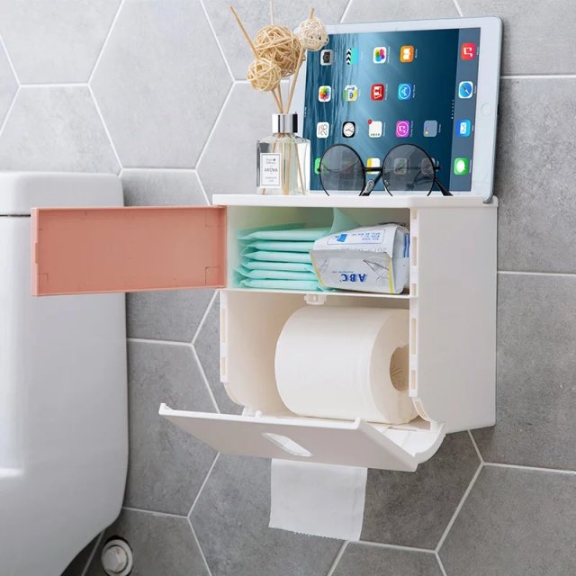 双层设计,置物分离,干净又卫生。顶部的置物架,方便放置香薰,眼镜等小物品。上层收纳盒,可以收纳私密物品。下层纸巾盒,实心空心的卷纸都可以放。锯齿口放卷纸,可以轻松撕开纸巾。光滑口放抽纸,方便抽取纸巾。