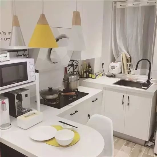 如果家里厨房的结构是水槽与灶台分别在两面墙上,那刚好可以台面做成两个高度,“L”型拐角的地方做区分。如果是一字型厨房,那就需要中间做落差了。